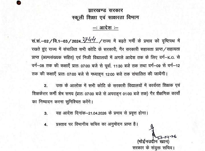 झारखंड में बढ़ती गर्मी और लू के प्रकोप को देखते हुए सरकार ने स्कूलों के समय में बदलाव करने का बड़ा फैसला लिया है। स्कूली शिक्षा एवं साक्षरता विभाग द्वारा जारी आदेश के अनुसार यह नया शेड्यूल 21 अप्रैल से राज्य के सभी सरकारी, गैर-सरकारी, सरकारी सहायता प्राप्त और निजी स्कूलों में लागू होगा।